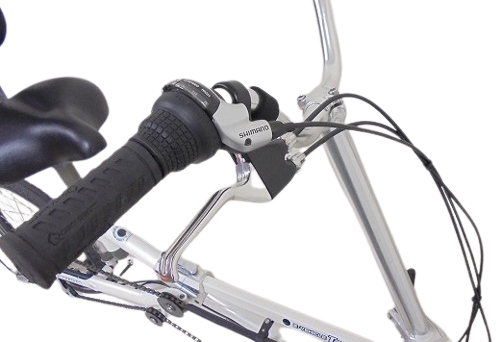 ver. 1.7 以降の右グリップ部です。 流石に見事に収まっていますが、 ハンドルバーは従来通りの 580mm となっています。 普通自転車の全幅は 600mm以下ですから、 ハンドル全幅が 580mm? 本当に勘定合ってます???? |