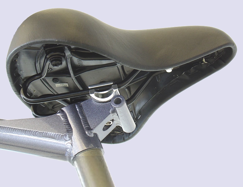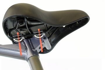 レールに取り付けられているのはサドルだけなんですから、そりゃそうでしょう。 ず〜っと昔からの自転車としては当たり前な現実が、 シート部の設計変更によってようやく実現されたことになっています。 これはいったいどういうことなのでしょう? 従来のものとの違いは、レールをクランプするやぐらがシートポスト上端にあるか、 シートフレーム前端にあるかということだけなので、サドルのスライド調整は全く同じです。 これは、普遍的なサドルの取り付け方法であって、機構と呼ぶような人はいません。 新たに追加されたものは何もありません。 また、最も肝心な事ですが、「サドルだけが前方へ」移されて、 「基本ライディングポジションはそのまま」な訳がないでしょうに ! ちょこっと前方に移しただけだから、基本的には変わらないというつもりでしょうか? 従来はダメだった小柄な方の乗車を可能ならしめる移動量なんでしょう? |