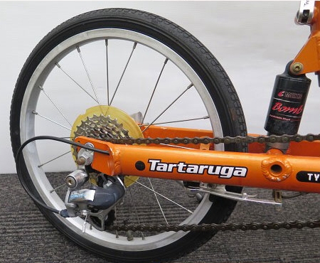 シートポストから抜いて背もたれも外せば、最小限の大きさまで分解できます。 ● ホイールは 16in./20H から 18in./36H へ、 ● 変速段数も 7(11-13-15-18-21-24-30T) 融通の利く仕様に。 02年夏にリリースされたDXグレードは、18in./36H です。 (SRAM DualDrive 3×8速+ディスクブレーキ+エアサス 本体価格 \198,000-) こちらを踏まえて仕様の整理が行われたと見るべきでしょうか? ● また、プーリーも04年に消音タイプに変更され、表立った不具合は解消されました。 プーリー代相当のささやかな価格UP実施。 |