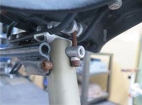 小柄な方には直立タイプのシートフレームと 150mmショートクランクで対応していました。 随分考え方が異なるようですが、 角度の問題を無視した安直に過ぎる局部変更であることは同じです。 左画像の横パイプを短くすればいいようなものですが、 どういう訳か、新型シートフレームでもここの変更を頑なに避けています。 |
